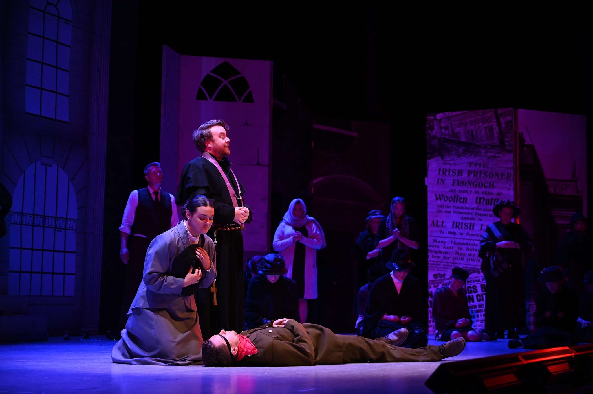 “Blood Upon The Rose” relates the sad and tragic story of Joseph Plunkett and Grace Gifford set against the Easter Rising in Dublin 1916. Plunkett’s love for Grace, immortalised in the song of the same name, comes to a tragic end with his execution in the “Stonebreaker’s yard” after his marriage to her the previous night in the chapel in Kilmainham jail. The humour, the wit, the passion, and the pain are all laid bare in this epic production. The deep divisions in Irish revolutionary thinking were severely exposed and indeed proved to be a major contributing factor to the military defeat of the rising. Writer and producer Gerry Cunningham has unleashed a historical masterpiece. So, sit back and let the cast and musicians of the River Tall Theatre Company take you right back to the heart of Dublin 1916.